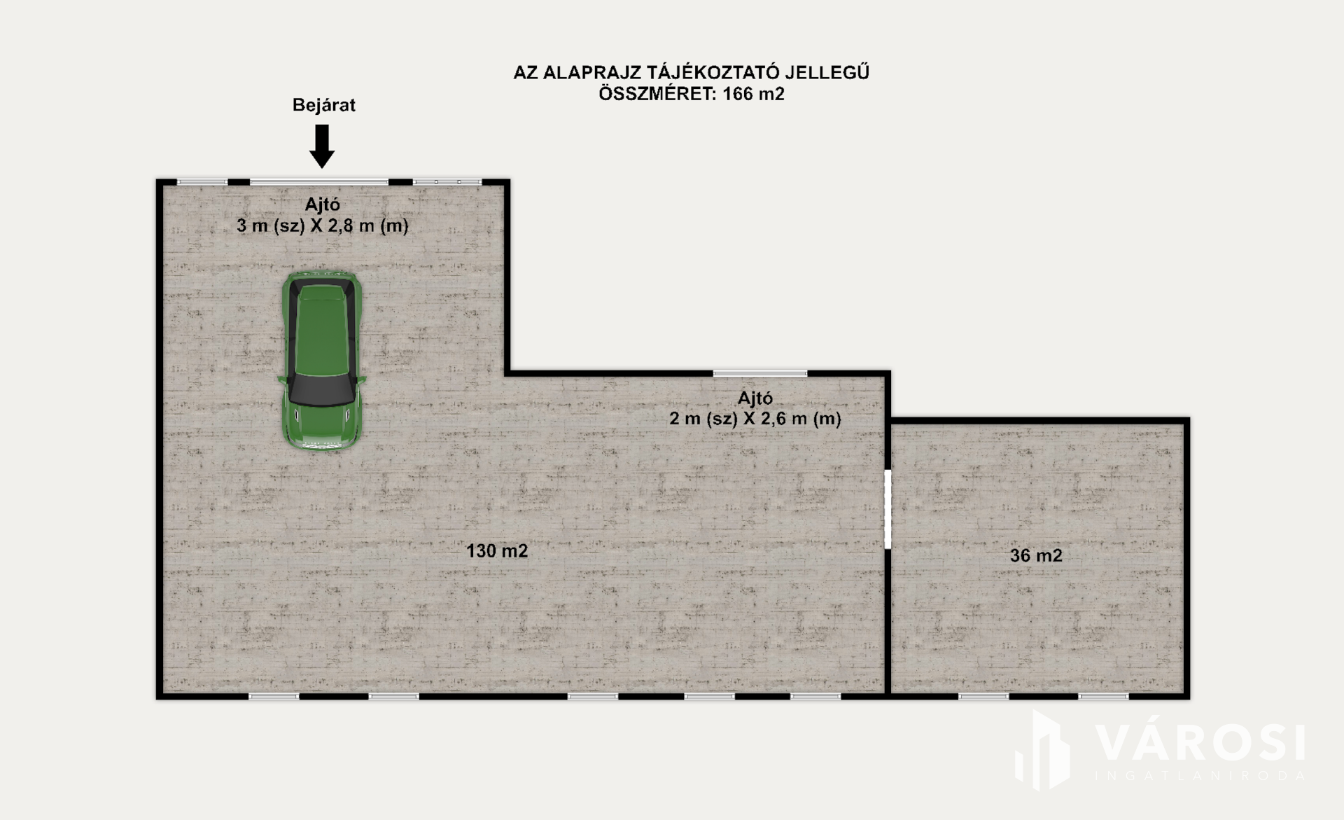 Bejárati ajtó: 3 m x 2,8 m, oldalsó ajtó 2 x 2,6 m. Belmagasság: 3 - 4,5 m között.