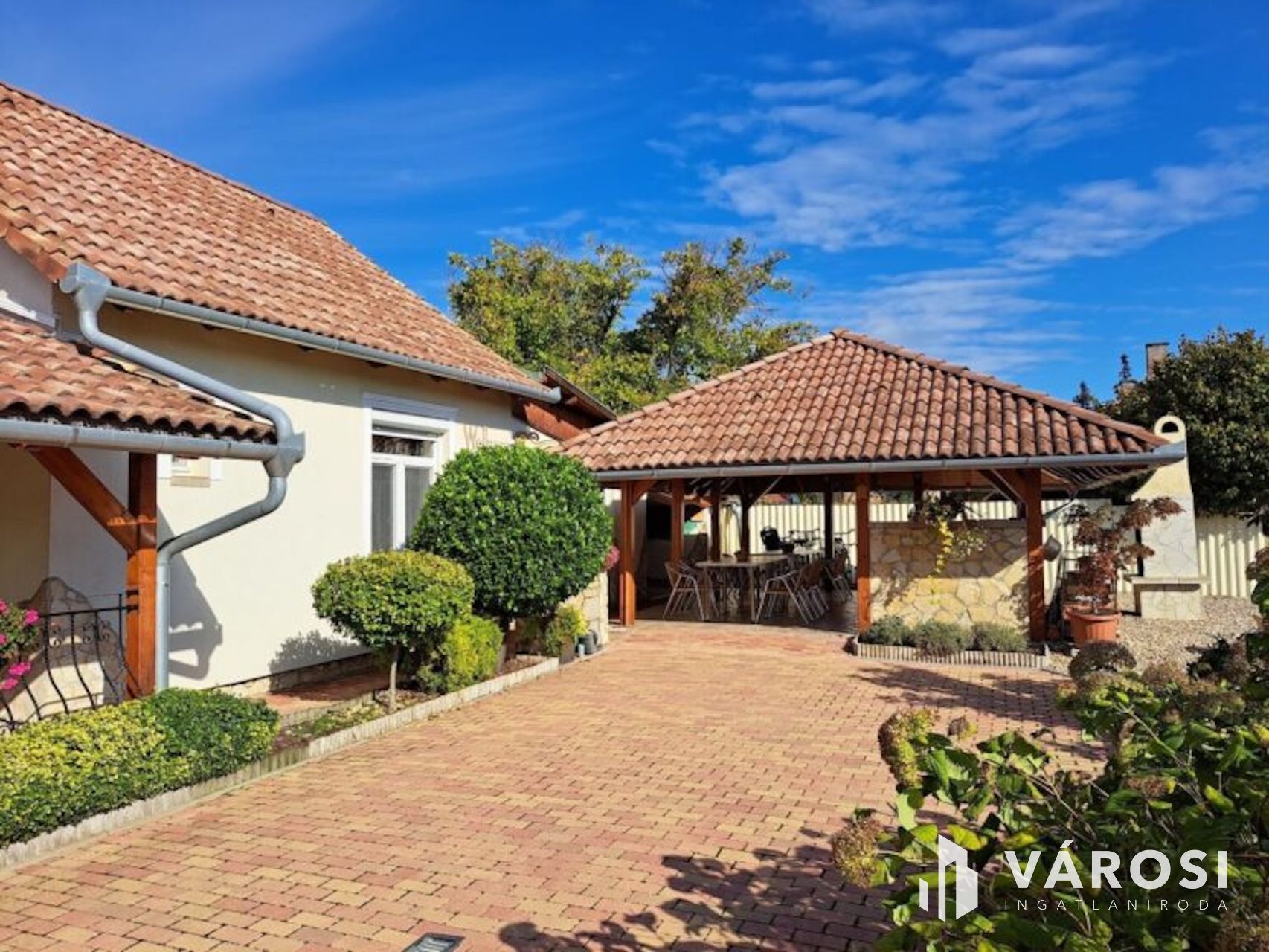 A tágas kertben a fedett terasz és gyermekjátszó mellett egy filagória is megtalálható, melyben szalonnasütő és grillező is ki lett alakítva. A duplatelken egy kertitó és számos dísznövény is helyet kapott, ez utóbbi öntözése fúrott kútról működtetett öntözőrendszerrel megoldott. Emellett 8 autó számára alkalmas beálló is kialakításra került. A telek méretéből adódóan igénytől függően további beépítésre is lehetőség van.