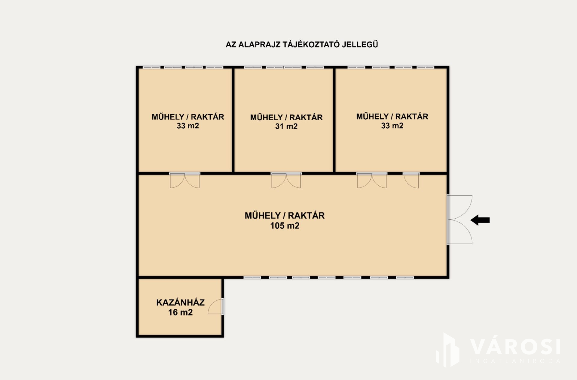 A legnagyobb egység 105 m2-es, melyhez további 3 helyiség tartozik: 33 + 31 + 33 m2, valamint egy 16 m2-es kazánház.