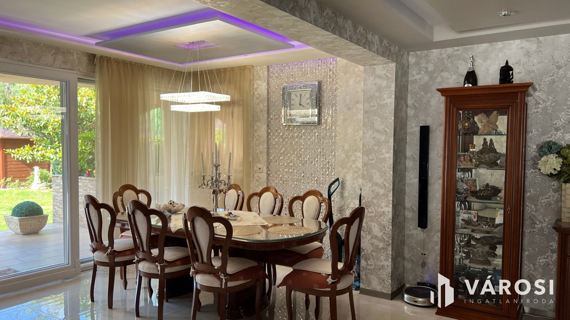 A 332 square meters independent luxury property for sale in Liget residential park, a prominent part of Debrecen. The lower level of the house has a living room, dining room, kitchen, an entrance hall, and a toilet. Naturally, there is also a large double garage and a terrace on the ground floor. On the upper level, there is a large space from which you can reach the three bedrooms and the two large bathrooms. The upper level also has a wardrobe, laundry and kitchen, and each bedroom has a terrace. The lot is large, 760 square meters, plus another lot of similar size is fenced off at the back. The garden is beautifully landscaped, and there is also a beautiful terrace equipped with everything. A heated swimming pool in front of the terrace provides residents with a pleasant feeling of luxury at home. The house has a high technical content and is equipped with all extras, fully furnished. Located in the most elite part of Debrecen, surrounded by high-end, beautiful properties.