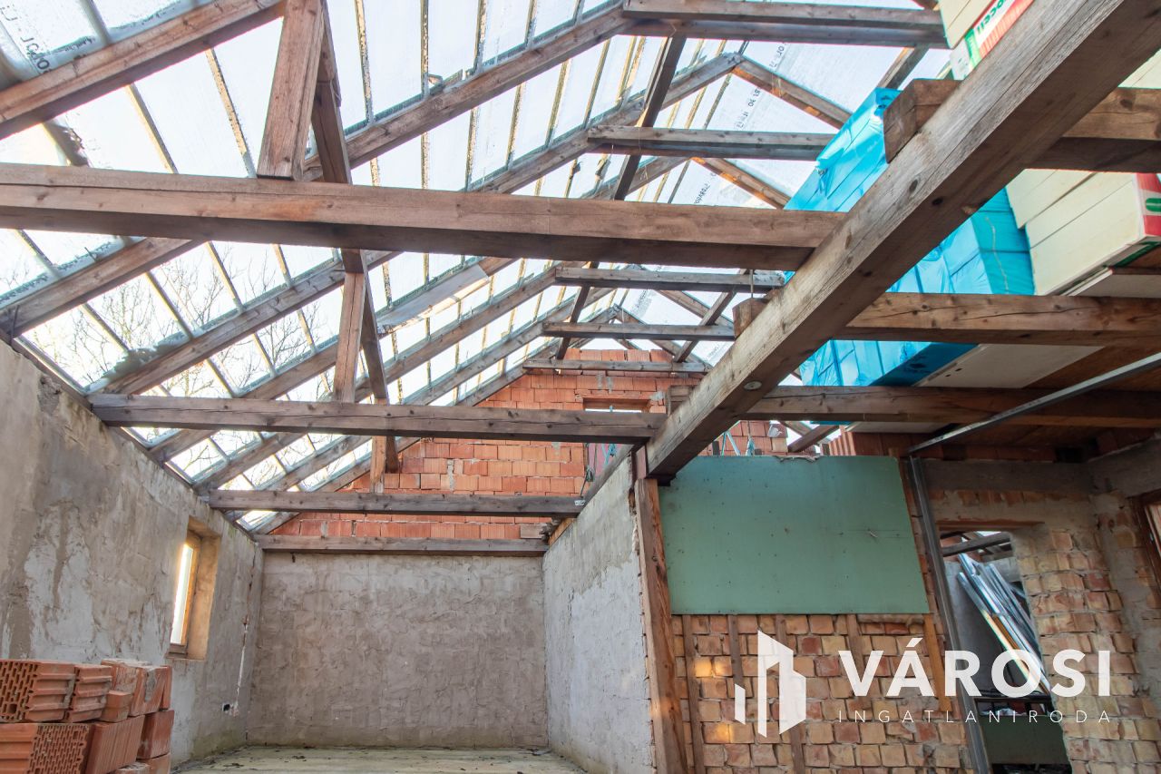 Befejezésre váró családi ház, mely az új tervek szerint 3 hálószobát, nappalit, konyhát étkezővel, gardróbot, fürdőszobát, külön WC-t és gépészeti helyiséget foglalna magában