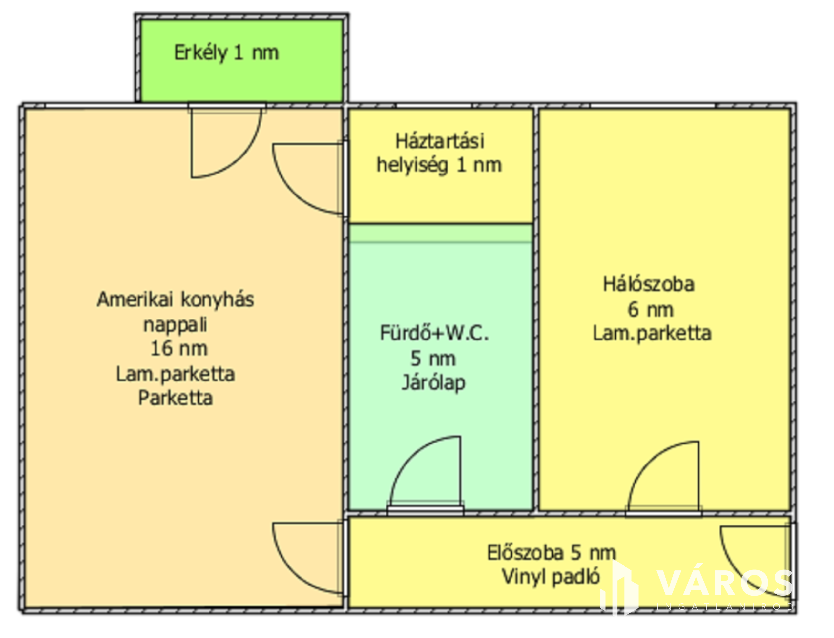 Helyiségei: amerikai konyhás nappali, hálószoba, előszoba, fürdőszoba, háztartási helyiség, erkély.