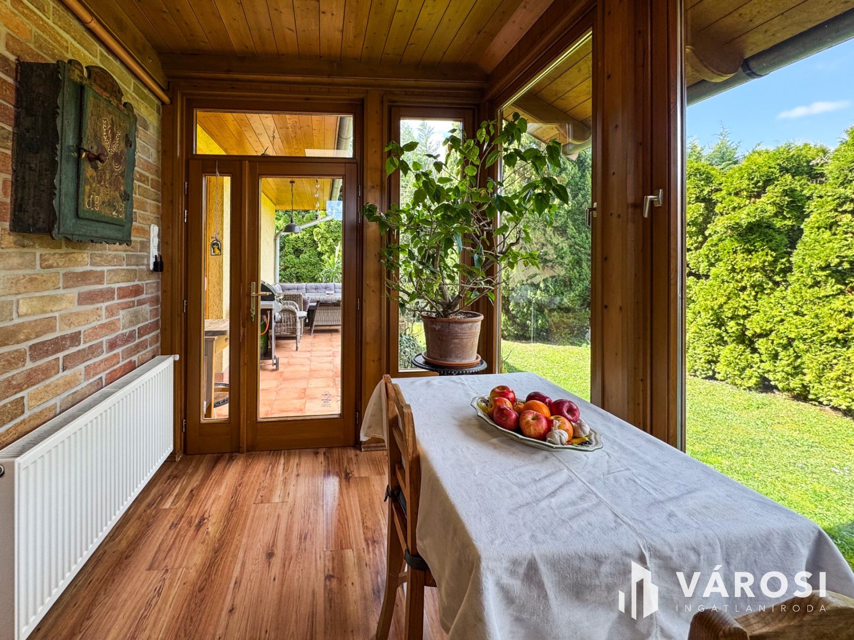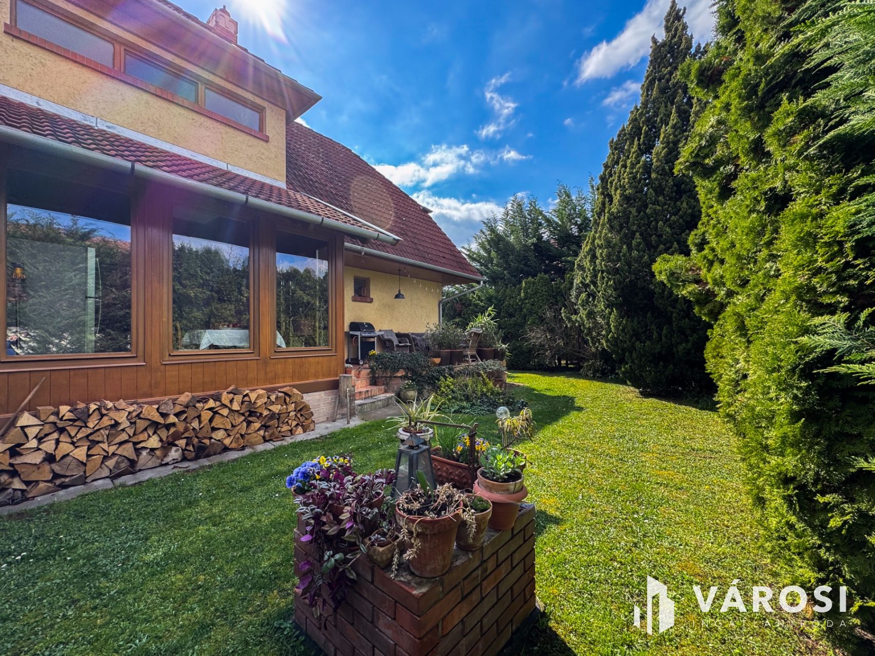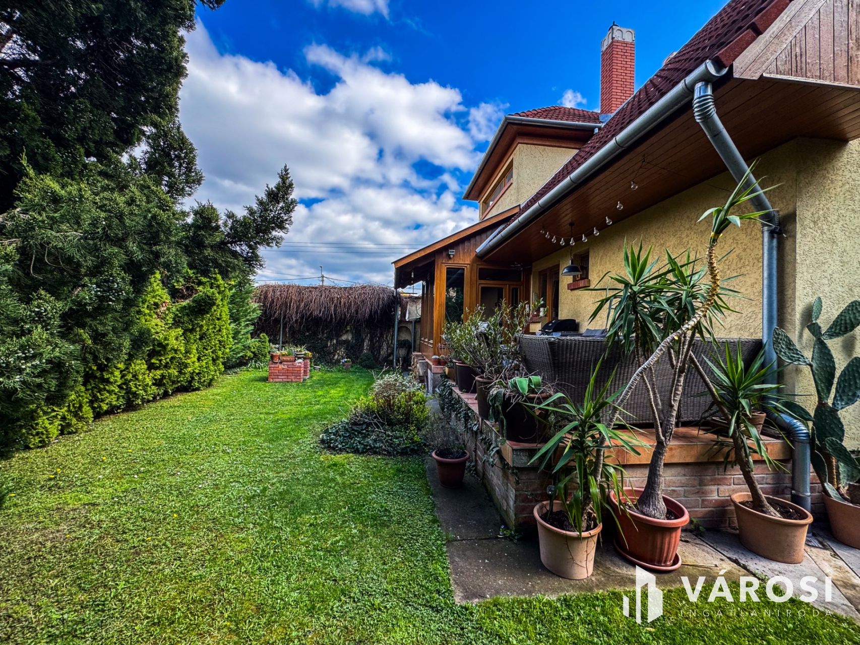 A kert igazi paradicsom a zöldövezeti életérzés kedvelőinek: fúrt kút és automata öntözőrendszer biztosítja a növények gondozását. A beépített szekrények praktikusan segítik a rendszerezést és a tárolást.