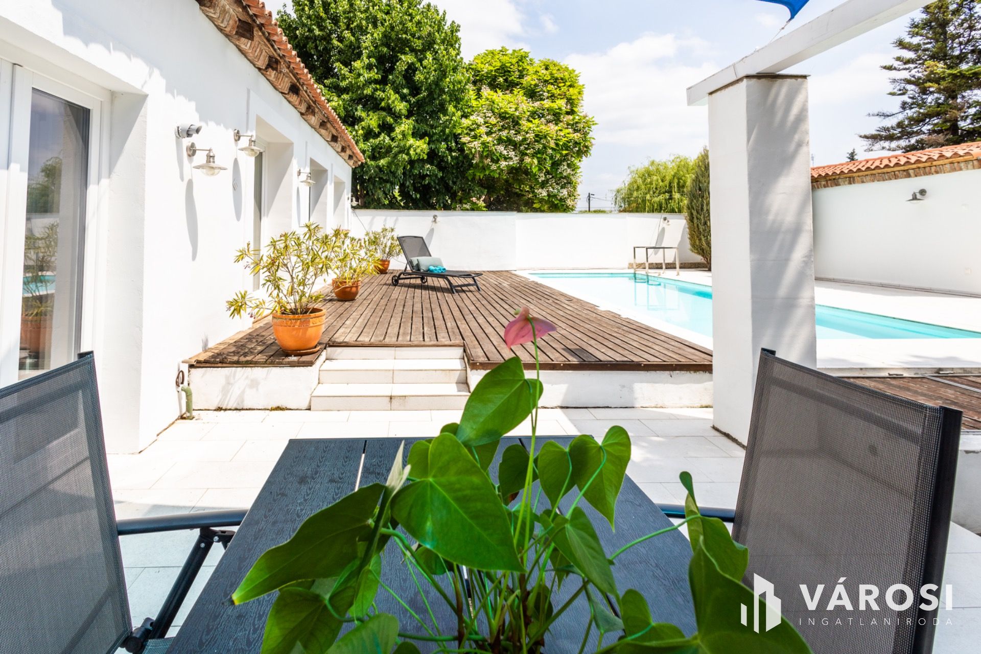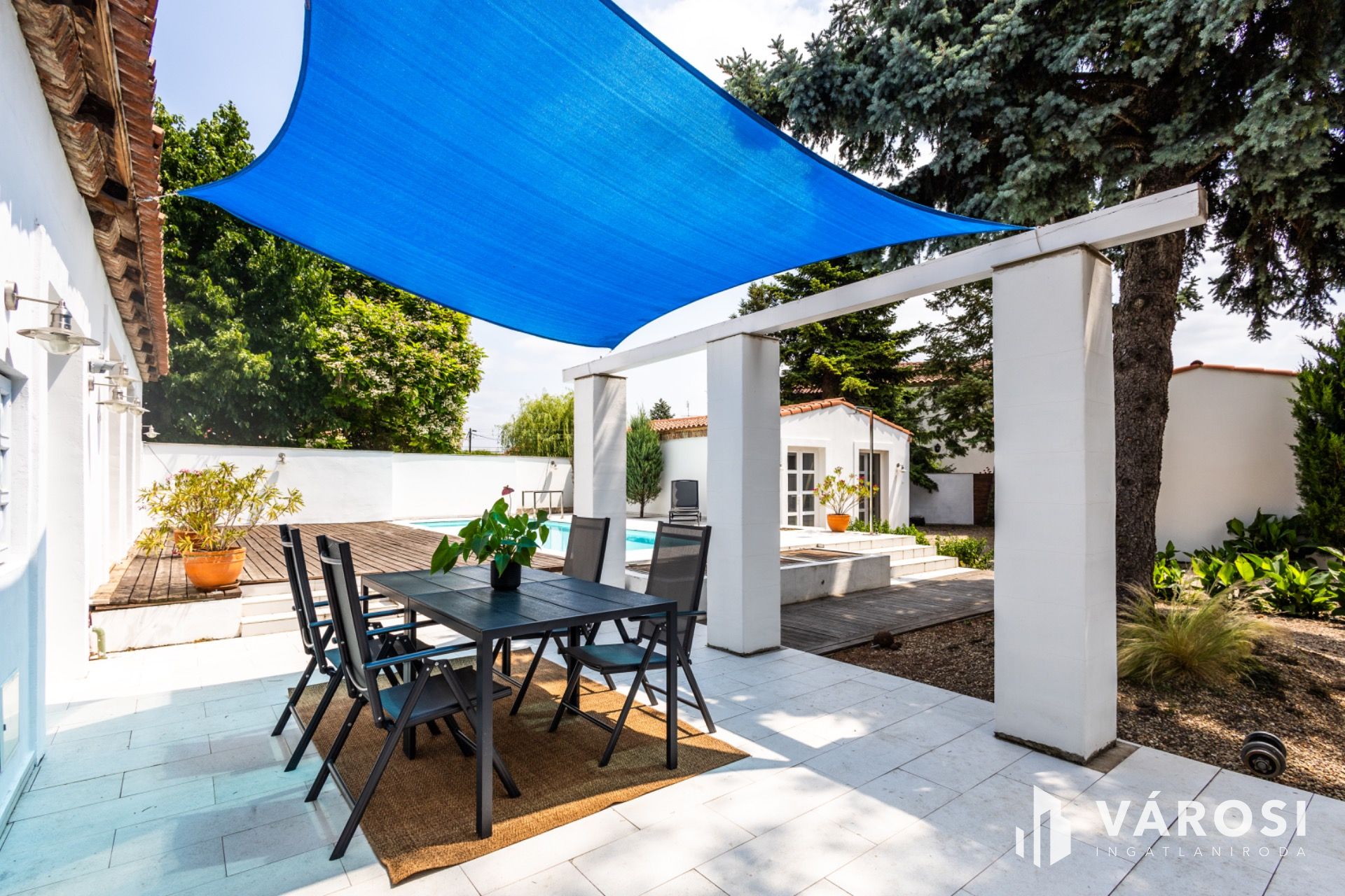 A kertben egy 3x 8 m alapterületű sósvizű medence is helyet kapott, mely tovább fokozza a mediterrán hangulatot.